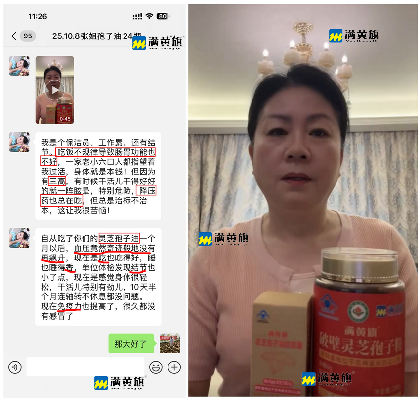 张旭:不管你是什么毛病吧,不管是更年期啊、失眠啊,皮肤衰老啊、血压高啊、腰膝酸软,身子骨虚、爱得病啊,只要你不舒服,或者有消化不良,便秘虚胖,头晕不适,体虚乏力,血液糖分高,女性宫寒怕冷、月经不调、气色不佳等问题,来试试长白山灵芝孢子油,吃上几天,一定会有变化!